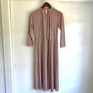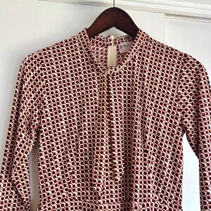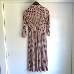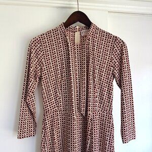 Philosophy 70's secretary-style dress with tie-neck detail at collar and concealed back zipper. Crafted with a cream and brown geometric print fabric that is both lightweight and breathable with medium stretch. This is a women's size XS, which is comparable to a US size 4.