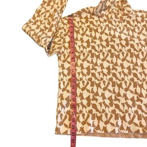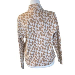 The design is unique, with a beige and cream pattern, a mock neck, and not cropped but not long either- the perfect waist accentuation!