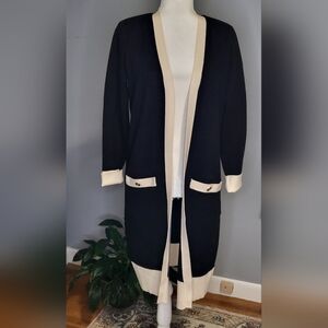 Classy black duster sweater from Philosophy with ivory trim and black and gold buttons on pockets in Size Small.