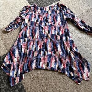 Philosophy Women’s blouse - 3/4 sleeves with brushstroke pattern. Features pink, blue, and black hues. Perfect for a bold look.
