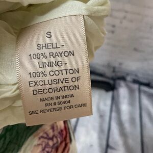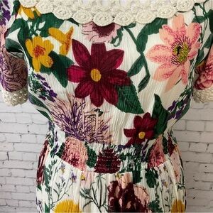 The dress is pre-owned but has been well taken care of and is still in great condition. It is lined and collarless, with accents of crochet and pleats. The dress length is long, and it comes in size S. The material is a combination of rayon and cotton, and it is machine washable. The dress is also available in a multi-color design that is perfect for the flower-themed occasion.