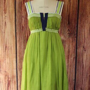 Gorgeous empire waist mini dress by Philosophy by Alberta Ferretti. Green silk with cotton ribbon style straps in white green and gray and pretty ribbon detailing at the neckline in navy blue. Ribbon ties around back. Side zipper. Size 4 USA. Lined in Rayon.