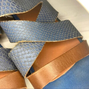 Textured blue and smooth brown leather flat strappy sandal. A bit of wear to the strap/worn out hole on one sandal but otherwise great preowned condition. Made in Italy.