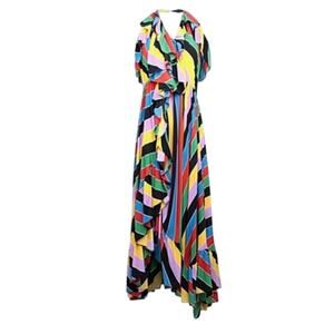 Colorful striped silk halter dress detailed with flounced trims, elasticated waist and asymmetric hem. For Resort, Serafini’s colors are vibrant, his shapes are ruffled and fluid, and his dresses are fringed with silk tassels. Watch them shimmy on the dance floor. ruffle-trimmed, rainbow-stripe poplin dress. For Resort, Serafini’s colors are vibrant, his shapes are ruffled and fluid, and his dresses are fringed with silk tassels. Watch them shimmy on the dance floor.