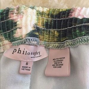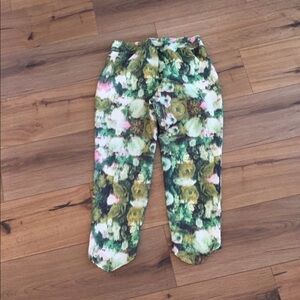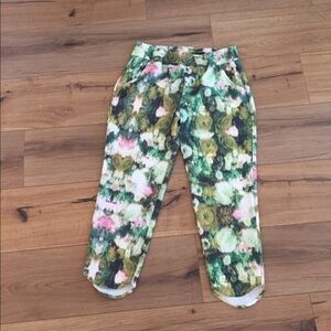 These cropped pants feature an elastic waistband with an all over geo print, and shirt tail leg openings. Laying flat across waistband 14 (has elastic waistband) inseam 22 beautiful spring colors