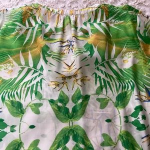 Philosophy women’s tropical print short sleeve blouse. Short cap sleeves. Finished collar and v-neck. Elastic at hip. Length shoulder to hip: about 24 inches. Length from shoulder to sleeve: about 6 inches. RN93178. 100% polyester. Gently worn a few times. Excellent condition. Size L.