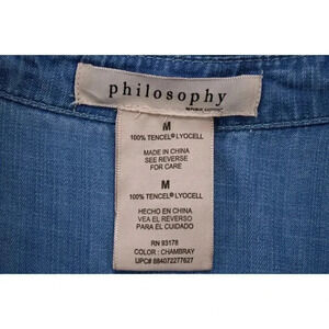 This is a Philosophy Tencel Chambray Shirt Dress that is a size Medium. It has roll tab sleeves and pockets. It is 100% Lyocel. Laying flat, it measures: Armpit to armpit-20.25" and the length is 35.5". It is in good condition.