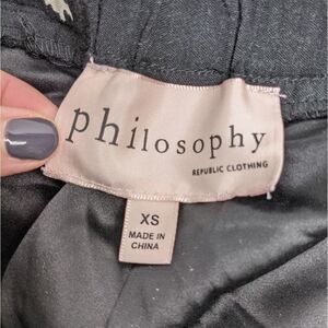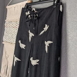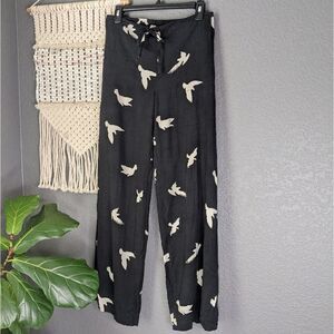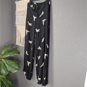 Lightweight and ultra soft wide-leg pants by Philosophy. Size exta small. Black with white bird pattern. Drawstring + elastic waistband. Front side pockets and back slit pockets. Lined. Rayon/Polyester/ Spandex.