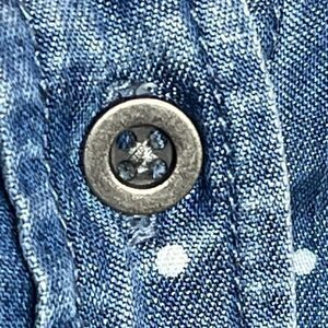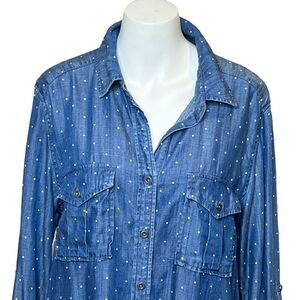 Philosophy chambray long sleeve polka dot shirt dress size L. Front pockets. Roll tab sleeves. Button up front. Good condition. 100% tencel lyocell. Length 34” Chest 21”.