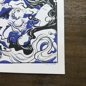 While any Phish fan knows the iconic work of Jim Pollock, Marq Spusta is equally celebrated in the gig poster community for his masterful, intricate style. This print is a perfect example of his work, featuring a mesmerizing Art Nouveau-inspired image of a koi fish and a flowing-haired figure in a bold blue, black, and white palette.