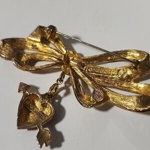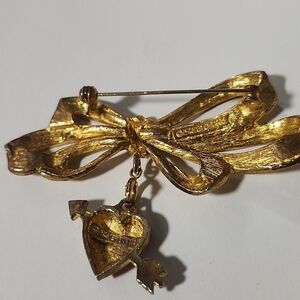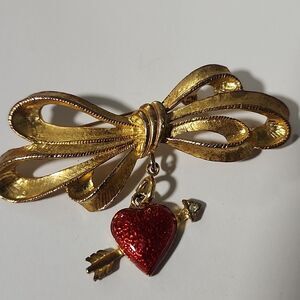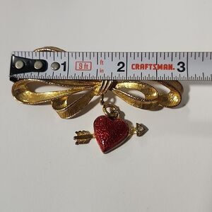 Elegant gold bow brooch featuring a charming red heart. Perfect for adding a touch of sophistication to any outfit.