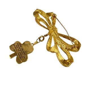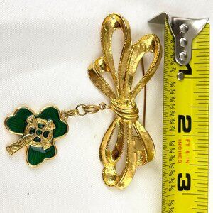 Phister Gold-Tone Bow Brooch With Dangling Green Enamel Clover Celtic Cross Char