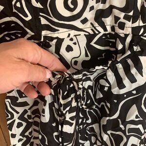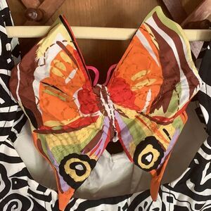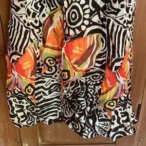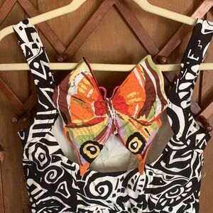 Phoebe Couture black and white print sleeveless dress with bright colorful butterfly’s on skirt. Sweetheart neckline with padded bra and fitted waist. Opening cut-out back with large embroidered butterfly detail. Hidden side zipper closure and drawstring at back. Beautiful dress!! Excellent Condition