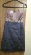 Showstopper that sparkles in the shimmering lights, this dress stands out yet conveys style and class. Straight strapless neckline with a thin black mesh trim atop a metallic mauve pink bodice. Steel blue metallic straight style skirt features sheer mesh paneling that extends to the bodice. Back bodice also features mesh paneling throughout. Exposed center back zipper. Boning in bodice for structure and support. Fully lined. Raw mesh material extends the hem line.