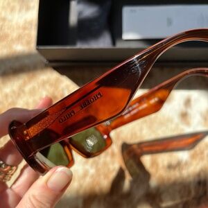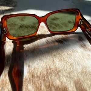 Phoebe Philo Score Sunglasses in brown tortoiseshell acetate, with wide temples and dark olive lenses. In very good condition, no scratches to the lenses and only minute scratches to the arms and frames (not visible unless under direct sunlight and up-close- please see photos). They come with the original box, care card, and cleaning cloth.