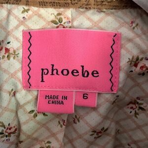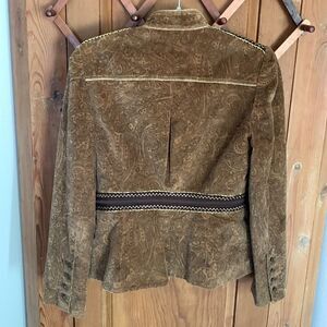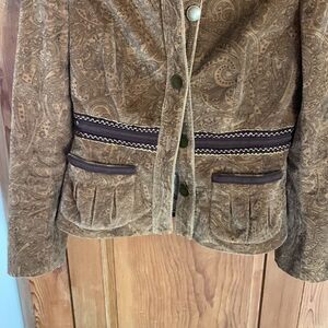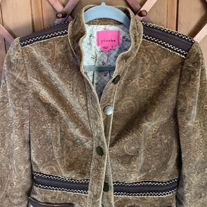 Phoebe brown gaberdine short jacket with paisley print design and gold threading and brown lace trim detail. Brass buttons down front and high neck collar. Front pockets with pleated detail and fitted waist. Fully lined with beige floral contrasting fabric. Excellent condition