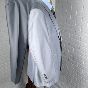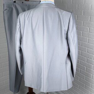 This Phoenix Clothes Suit features a light gray embossed stripe pattern, styled from the 70s and 80s. The size is 46 with a 42Wx30.5L pant. It's a 2-piece polyester suit, elegantly tailored for men.