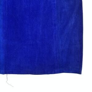 Vintage suede leather skirt by Phoenix, crafted in a bold cobalt blue genuine cowhide suede with a clean straight silhouette. Fully lined in acetate for a smooth interior, it has structured paneling and a classic above-knee length shape. The interior tag lists womens size 3/4 and it is made in the USA.