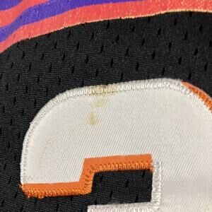 Condition: Good used condition. Signs of wear and wrinkling on stitched letters and numbers. Visible yellow spot stains on the front "3" and some fading/cracking on printed graphics. Back name and numbers have some discoloring, fraying, and wrinkling. Closeup photos show all notable flaws. Small white spot on lower back right. Please review all photos carefully.