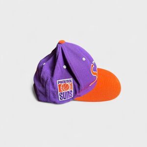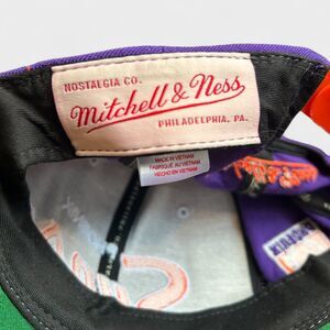 Official Mitchell & Ness Hardwood Classics Phoenix Suns snapback hat. Features purple crown with orange flat brim and embroidered Suns logo across the front. Adjustable snapback closure for a custom fit. Classic throwback NBA style, perfect for fans and collectors.