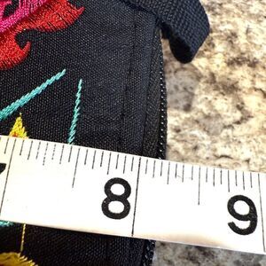 Phoenix clutch card holder black with floral peacock 8 inches long 47 inch strap 5 inch wide zipper several card holders excellent condition no issues