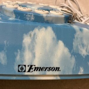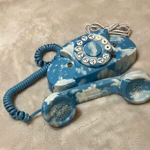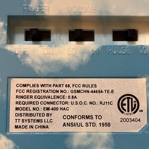 A traditional Land Line house phone. Princess style. Push button. Emerson Brand pretty sky blue color !! Has adjustments on the bottom for on and off ringer, low and high volume, and for the pulse tone. Has connection wire cord.