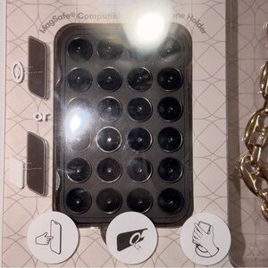 Suction Phone Holder & wrist strap. Enhance your phone with the Midnight Shadow Phone Bundle Set. This set includes a sleek black phone holder and a stylish silver wrist strap, compatible with all smartphones. Perfect for secure and convenient use.