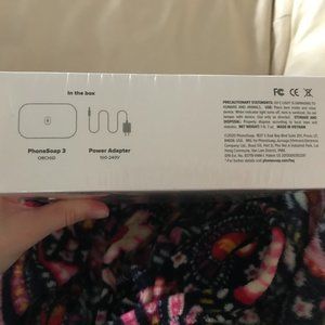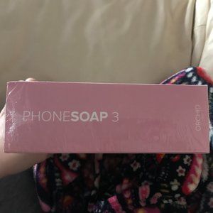 Phone Soap 3 Charger UV Sanitizer and Charger. Color- Orchid. Item comes with the phone soap and the power adapter. Box says it is able to sanitize phones of all sizes and you can charge multiple devices at once. This item has NEVER been opened. As you can see from the pictures the wrapper is still intact and there are no damages to the box at all. I got it as a present and I just know I would never use it.