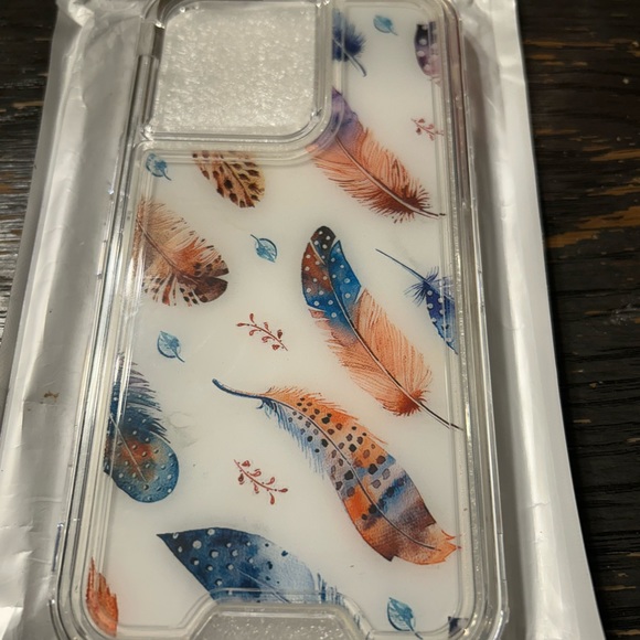 I phone 14 pro max. Feather theme. Phone case New never use it is clear plastic with feather theme