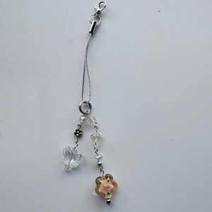 This charming phone charm showcases a floral pendant with pink and silver hues, adding a delightful touch to your phone