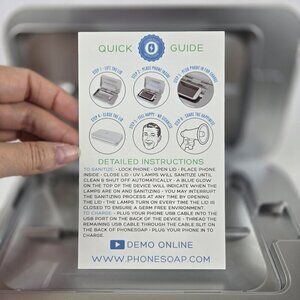PhoneSoap cleans and sanitizes the surfaces of your phone. Offers 360 degree disinfection with UV-C light. To use, plug the attached cable into the wall and then into the back of the case. Open, place your phone inside and then close and it begins to work. In addition, your phone charging cable can be plugged into the unit and also into your phone so that the phone will be charging at the same time. Safe to use daily. A good way to make sure your phone is sanitized often. Sleek case with an interior compartment of 6.75" x 3.5" to fit most phone models. Instructions included.