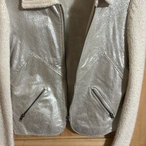 Ivory and silver coloring, shiny metallic, knitted long sleeve, full zipper, zipper pockets, genuine leather.