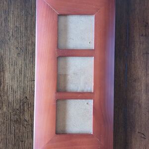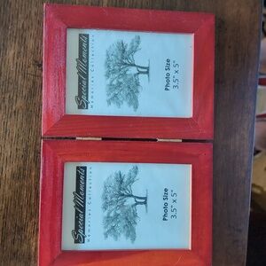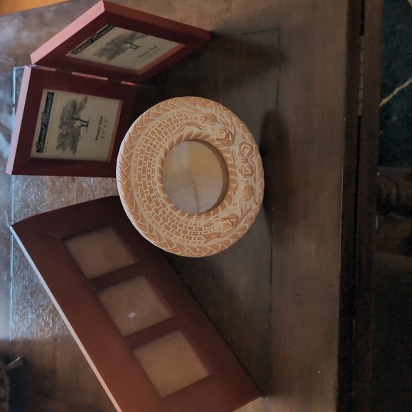 3 photo frame bundle. The long one holds 3 3 x 3 photos. The foldable one holds 2 3.5 x 3.5. The round one is 3" in diameter. All are in great condition. All have glass in excellent condition.