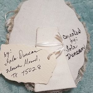 Small frame created from Vintage linens, laces & buttons. Trimmed with hand-rolled rose's and ribbon bows. Edged with vintage lace edging.