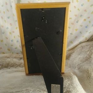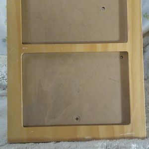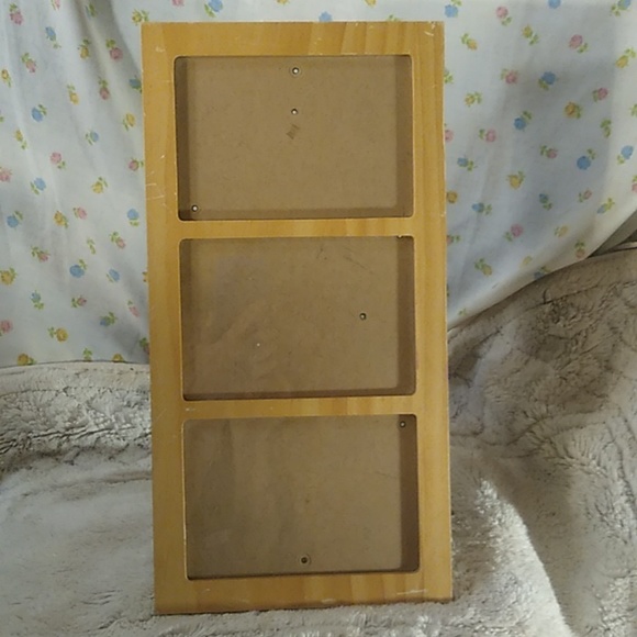 Light wood colored 3 slot picture frame. It has the hardware to sit on a flat surface or hang on a wall. The entire frame measures 8 1/4"×16 1/4". It holds three 5"×7" pictures. It is not new and has scratches.