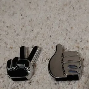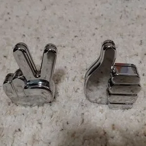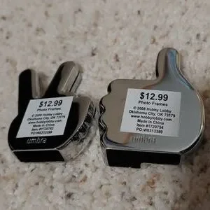 Two really cute photo frames, 1 is peace sign and 2 is a thumbs up! Nice silver color with black felt on bottom! These have some weight also, your pics would look so cute in them!
