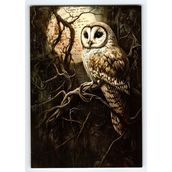 Measuring approximately 5.5 by 4 inches, this postcard is printed on high-quality paper stock with a classic vintage design on the reverse side, including space for messaging and postage. The absence of postmarks or writing indicates it is unposted, preserving its pristine collectible value. Ideal for Halloween decoration, themed collections, or as a unique gift, this owl postcard blends artful craftsmanship with the timeless allure of nocturnal wildlife and holiday mystique.