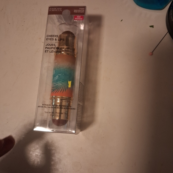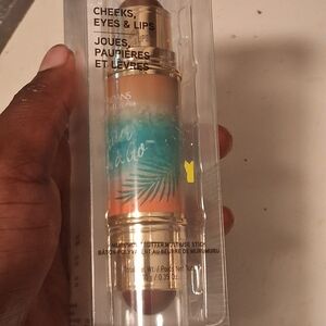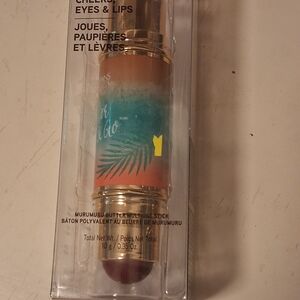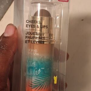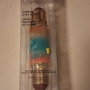 Versatile stick for cheeks, eyes, and lips. Features a vibrant orange and teal design.