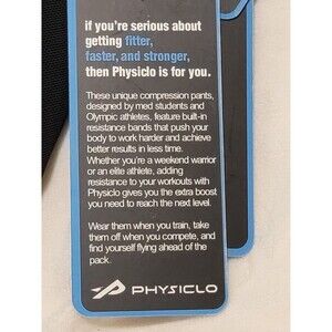 NWT Physiclo resistance band training wear womens pants designed with built-in resistance bands to help activate muscles and enhance workouts. Comfortable stretch fabric with a performance fitgreat for fitness training, walking, gym sessions, and everyday athleisure. Supportive, functional design for active lifestyles. Excellent condition. 1st 3 pics are right side out, next 2 are inside out to show bands.