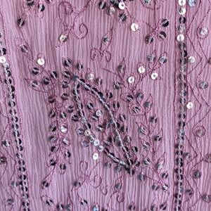 Pia Hallstrom dusty rose semi-sheer pink tunic with silver sequins, size M. Generally good preowned condition. Some spots in back and on one sleeve and on shoulder (see photos) that could come out with treatment. 15.5-inch side slits.
