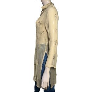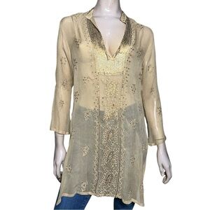Pia Halstrom Women’s Size M Tan Nude Crinkle Silk Chiffon Gold Sequin Tunic Top. Semi sheer. Side slits.