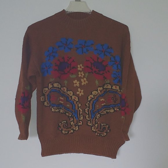 Colorful knitted in design on this Pia Rucci med. brown 100% wool sweater. In excellent condition