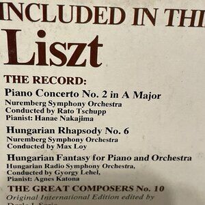 Liszt Piano Concerto No. 2 In A Major/Hungarian Rhapsody No. 6/Hungarian Fantasy For Piano And Orchestra (Vinyl, 1976) RCA Custom FW-310 VG. Used with some wear and blemishes see pictures sold as is. Cover has stains. Record has some light scratches.