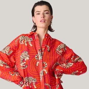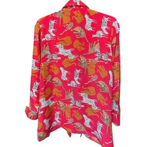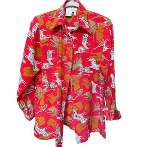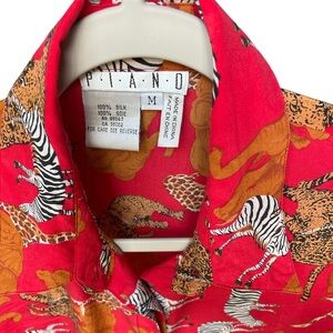 Stunning! 100% silk, red color, fabulous safari print Sz M, concealed front buttons in good condition condition!
