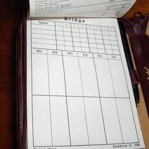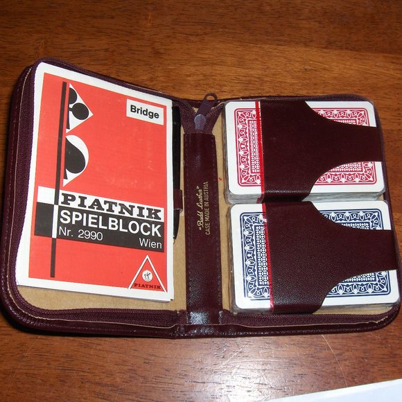 Piatnik Playing Cards in Leather Zip Case. Never Used, pad and sealed cards.. Has Bridge Pad and Pen, leather Case is made in Austria, Has imperfections, as pictured U-12