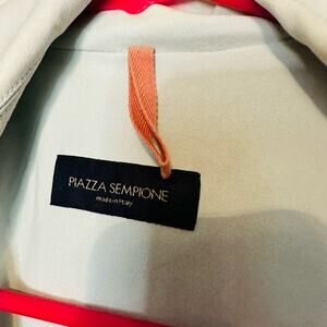 The Piazza Sempione Baby Blue Belted Collared Button Front Jacket size US 8 is a stylish and versatile piece that can be dressed up or down. It is made of a soft and lightweight fabric with a slight sheen, and features a flattering belted waistline. The jacket has a classic collared neckline and button front closure, and is finished with two front pockets.