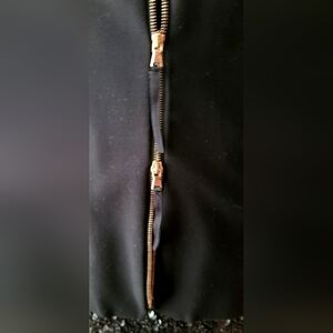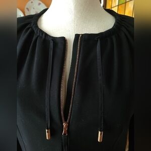 This Piazza Sempione black stretch collarless jacket is very versatile. It can be worn over both formal and informal wear. The closure is a two-way frontal zipper.