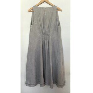 Gorgeous Piazza del Tempio linen dress—perfect for easy summer days, vacation, easy summer days. Flattering sleeveless A-line silhouette. Princess seams. Shirred elasticated panel in back for waist definition and comfort. Fringed hem at bottom and keyhole button detail at back neck. Scoop neck. The neutral gray color is a versatile addition to any wardrobe. 100% linen. Made in Italy. Size large; approximate flat measurements: underarm to underarm 18.5", length 39". Excellent condition.