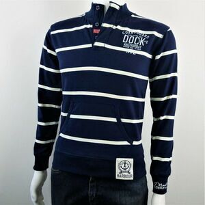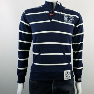 Double Placket , Stand Up Collar. Navy Blue , White Striped .