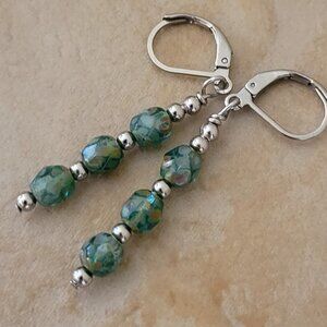 Beautiful, Czech firepolished Picasso Green crystal, stainless steel lever back earrings.